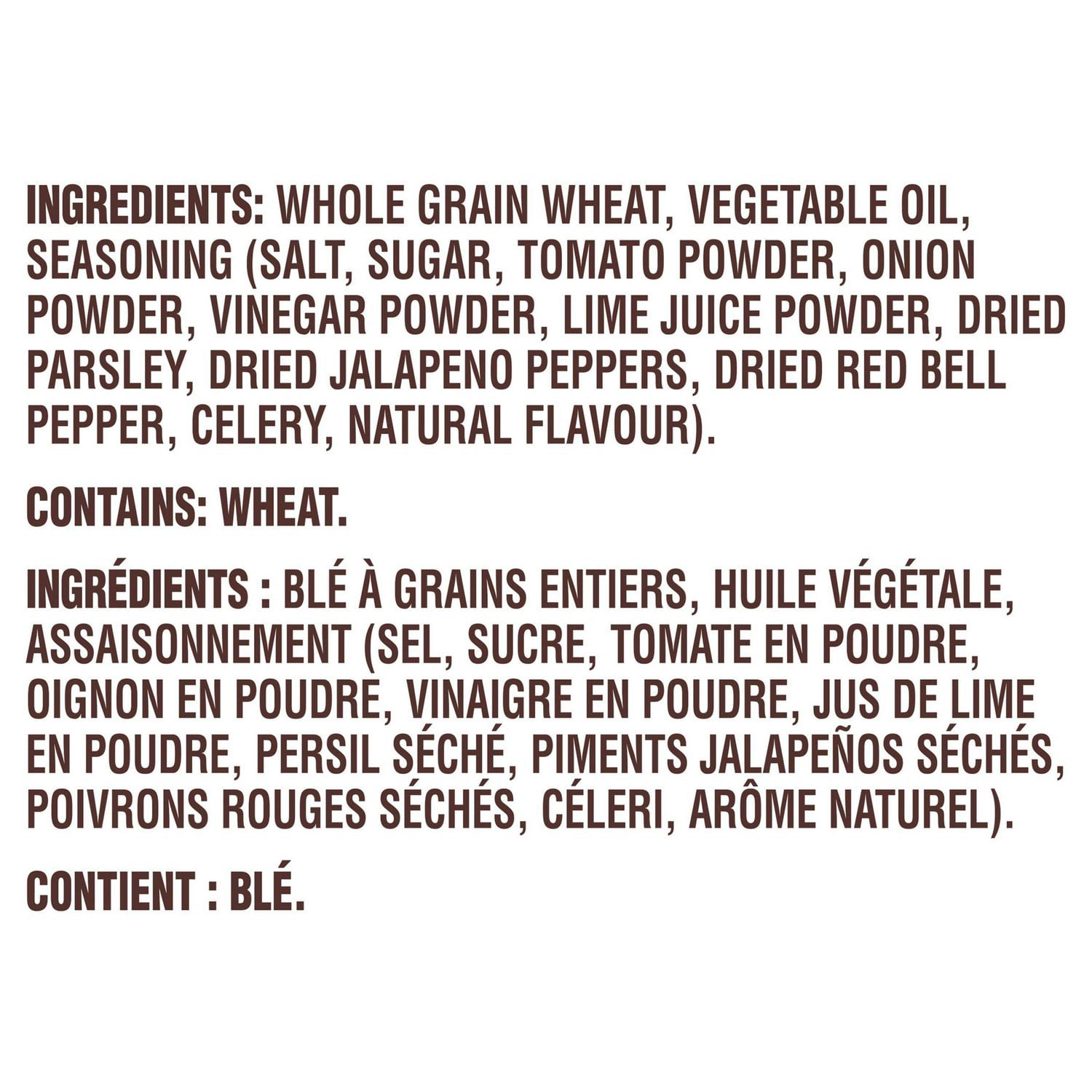 – Seasoning [salt, sugar, tomato powder, onion powder, vinegar powder, lime juice powder, dried parsley, dried jalapeño pepper, dried red bell pepper, natural flavor (contains celery)]