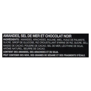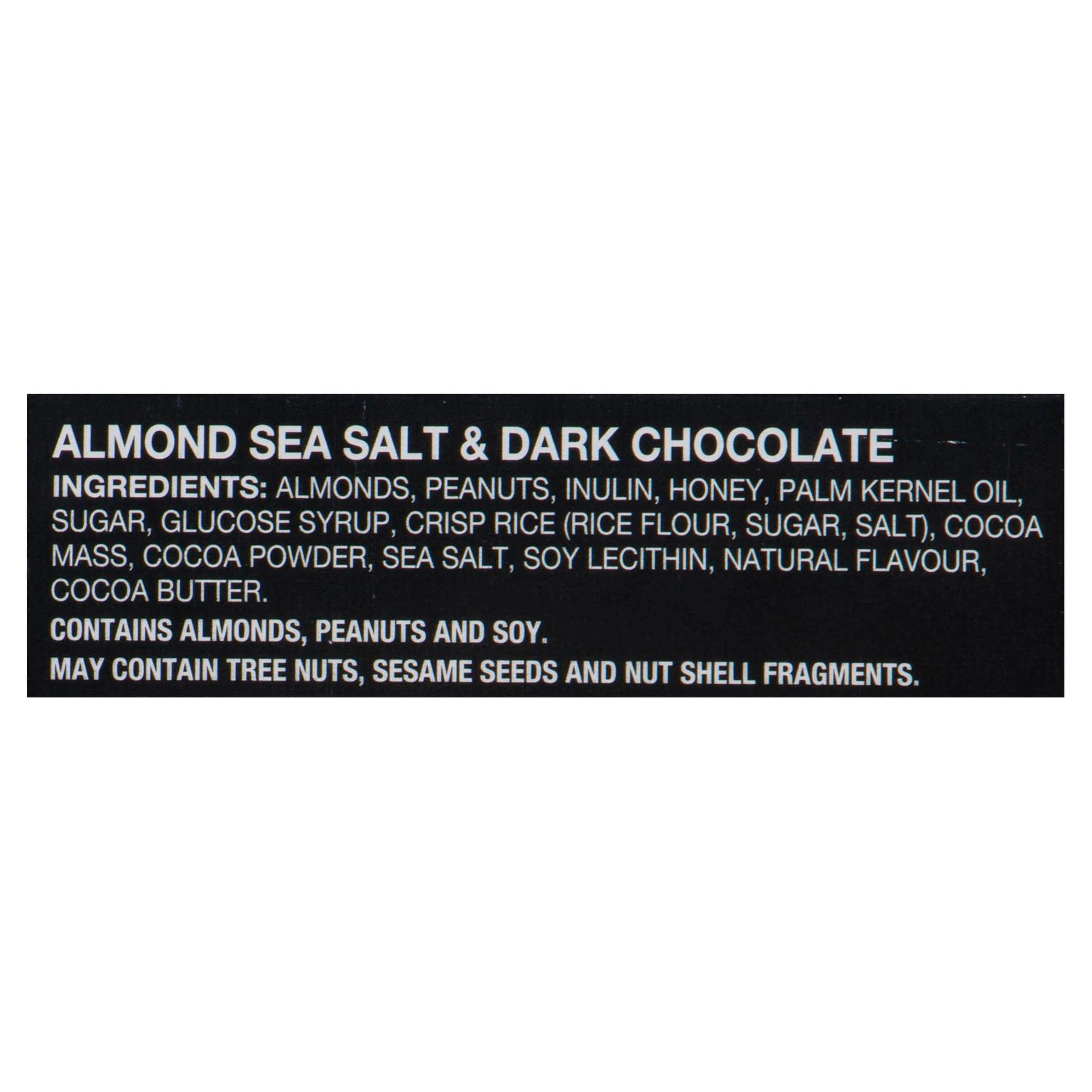 ALMOND SEA SALT & DARK CHOCOLATE INGREDIENTS: ALMONDS, PEANUTS, INULIN, HONEY, PALM KERNEL OIL, SUGAR, GLUCOSE SYRUP, CRISP RICE (RICE FLOUR, SUGAR, SALT), COCOA MASS, COCOA POWDER, SEA SALT, SOY LECITHIN, NATURAL FLAVOUR, COCOA BUTTER. CONTAINS ALMONDS, PEANUTS, AND SOY. MAY CONTAIN TREE NUTS, SESAME SEEDS, AND NUT SHELL FRAGMENTS.