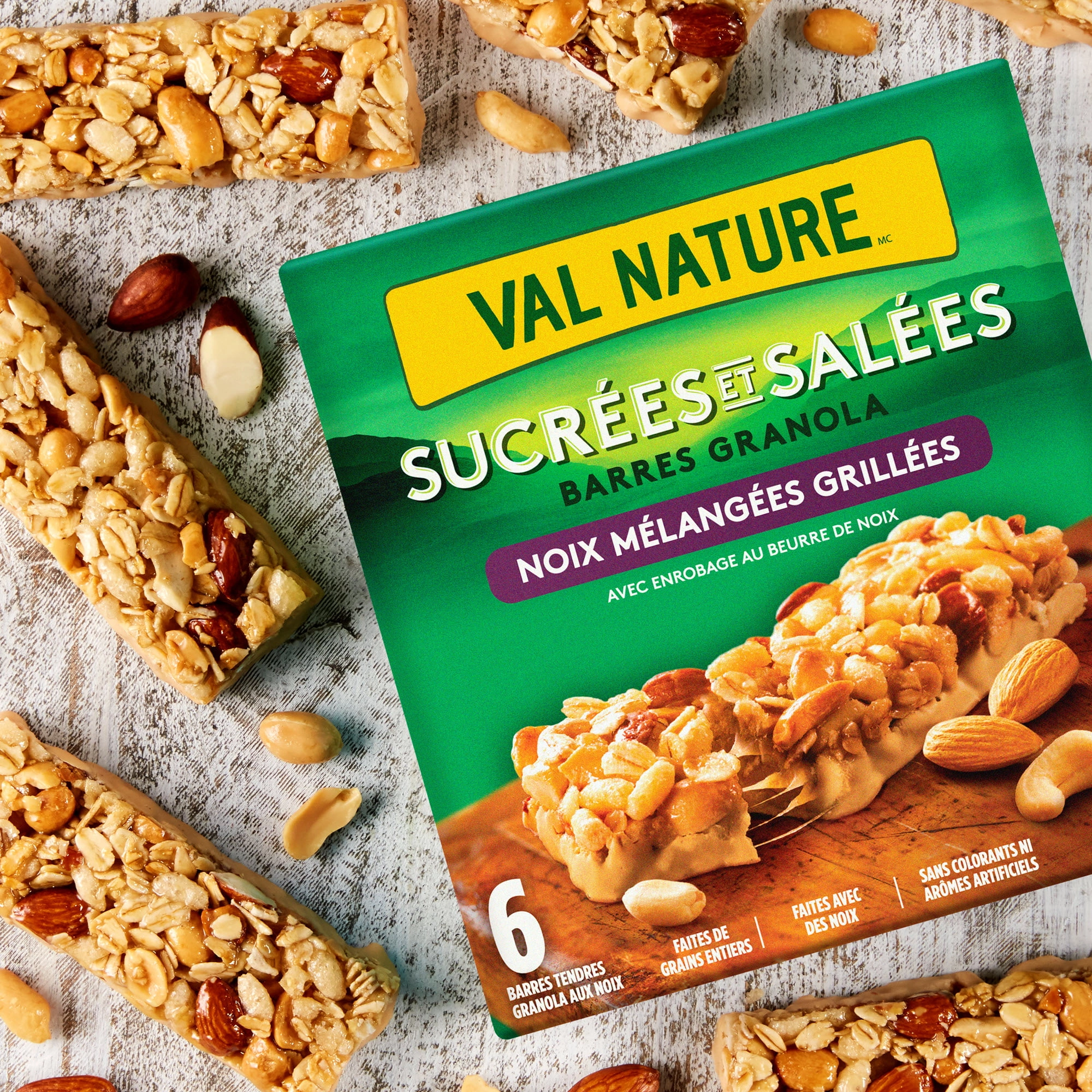 - CHEWY GRANOLA BARS: Sweet meets salty with a mix of cashews, peanuts, and almonds dipped in a creamy nut-butter coating.