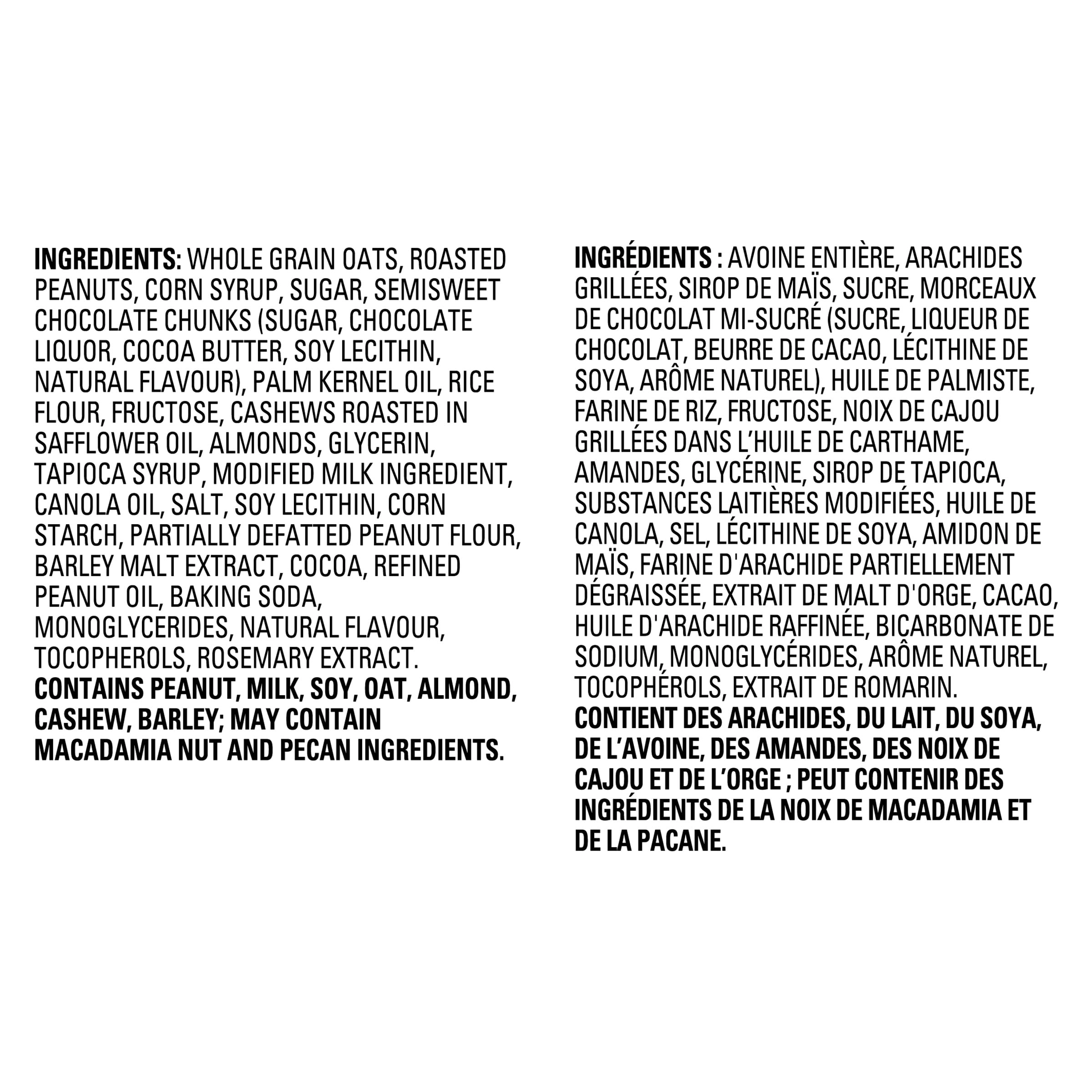 WHOLE GRAIN OATS, ROASTED PEANUTS, CORN SYRUP, SUGAR, SEMISWEET CHOCOLATE CHUNKS (SUGAR, CHOCOLATE LIQUOR, COCOA BUTTER, SOY LECITHIN, NATURAL FLAVOR), PALM KERNEL OIL, RICE FLOUR, FRUCTOSE, CASHEWS ROASTED IN SAFFLOWER OIL, ALMONDS, GLYCERIN, TAPIOCA SYRUP, MODIFIED MILK INGREDIENT, CANOLA OIL, SALT, SOY LECITHIN, CORN STARCH, PARTIALLY DEFATTED PEANUT FLOUR, BARLEY MALT EXTRACT, COCOA, REFINED PEANUT OIL, BAKING SODA, MONOGLYCERIDES, NATURAL FLAVOR, TOCOPHEROLS, ROSEMARY EXTRACT. CONTAINS PEANUT, MILK, SOY, OAT, ALMOND, CASHEW, BARLEY; MAY CONTAIN MACADAMIA NUT AND PECAN INGREDIENTS.