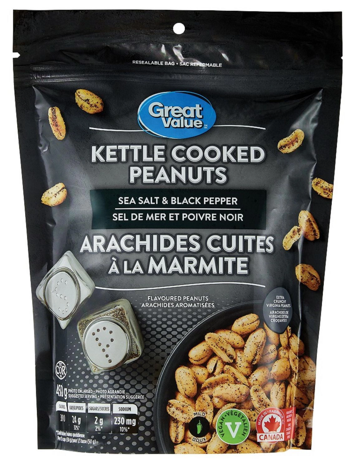 Indulge in the irresistible crunch and bold flavor of Great Value Sea Salt & Black Pepper Kettle Cooked Peanuts. These peanuts are made for those craving-crushing moments when you need a satisfying snack. Each nutty nugget is crispy, crunchy, and delicately dusted with classic sea salt and black pepper seasoning. Made in Canada, these peanuts are crafted with care using both domestic and imported ingredients. Plus, they are vegan-friendly and free from artificial flavors and colors, so you can enjoy them guilt-free.